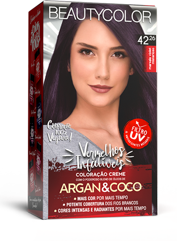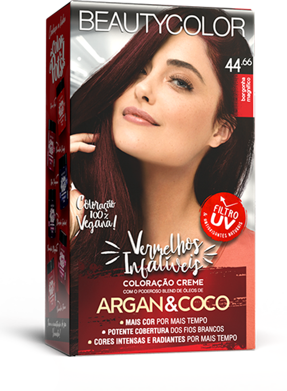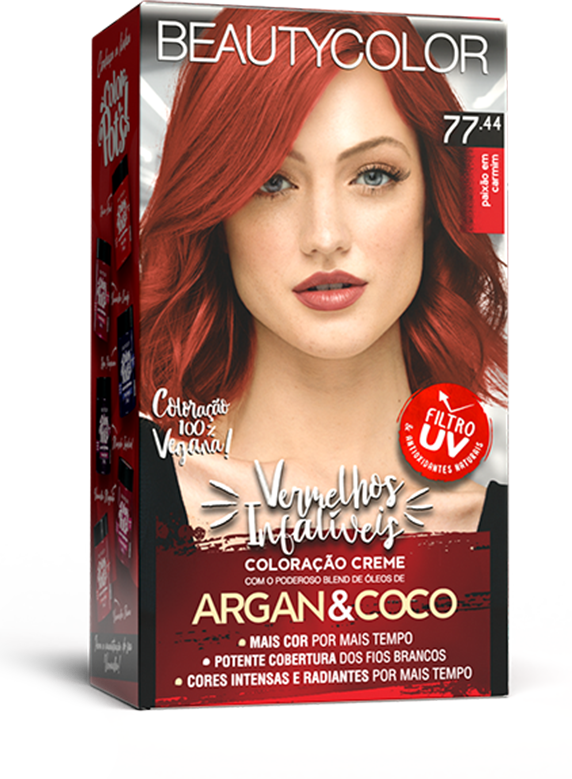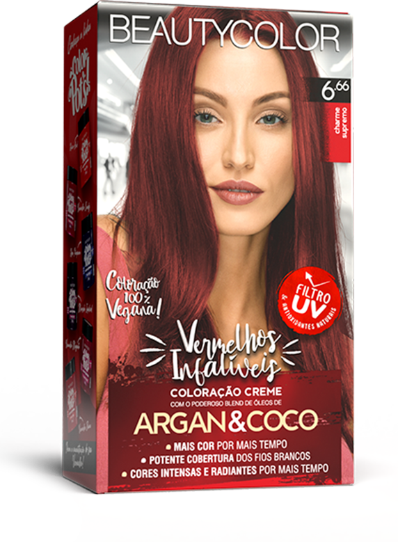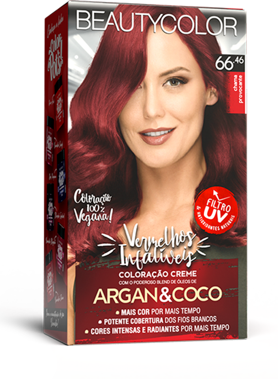 Coloração vegana, os Vermelhos Infalíveis BEAUTYCOLOR contém um blend de 8 óleos que hidratam e nutrem os cabelos e o exclusivo sistema Color B-lock que retém 65% mais cor e mantem a cor intensa e radiante por mais tempo.