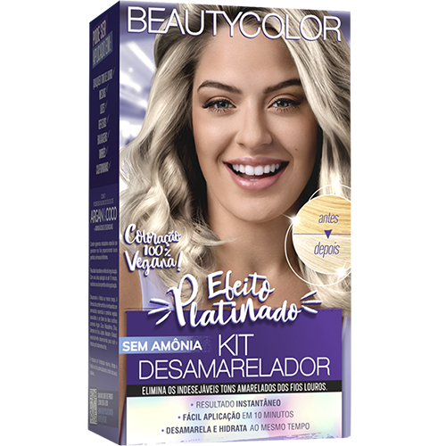 Com o Kit desamarelador, você matiza seu cabelo em 10 minutos. Sua fórmula contém pigmentos especiais que penetram nos fios, deixando o platinado perfeito e muito brilhante.