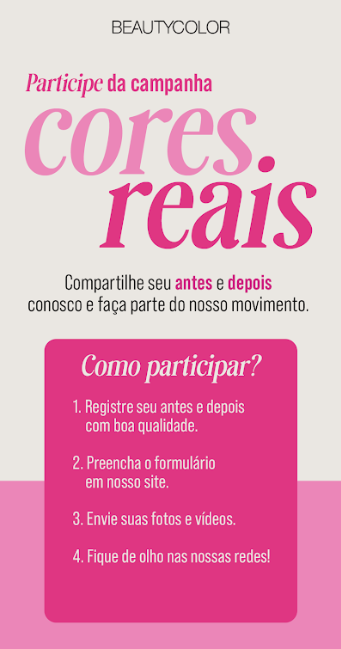 A campanha Cores Reais Beautycolor é um movimento que celebra a diversidade em todas as suas formas. É um convite para que TODA pessoa compartilhe a própria transformação e mostre o que a cor representa em sua história Usando a hashtag #CoresReaisBeautycolor, consumidores podem enviar fotos e vídeos de antes e depois, participar dos conteúdos nas redes sociais e inspirar outras pessoas a viverem o mesmo processo de expressão e autoconfiança. Participar é simples: basta realizar uma transformação com a linha Cores Reais Beautycolor, registrar o resultado e publicar com a hashtag da campanha. As histórias mais inspiradoras podem aparecer nos canais oficiais da marca, mostrando que cada cor carrega um sentimento, uma fase e uma identidade. |